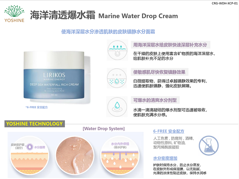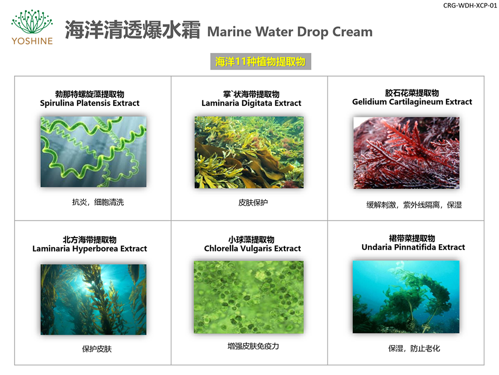 海洋清透爆水霜:含海洋11种植物提取物,安全-无防腐剂配方,使海洋深层水分渗透肌肤的皮肤镇静水分面霜